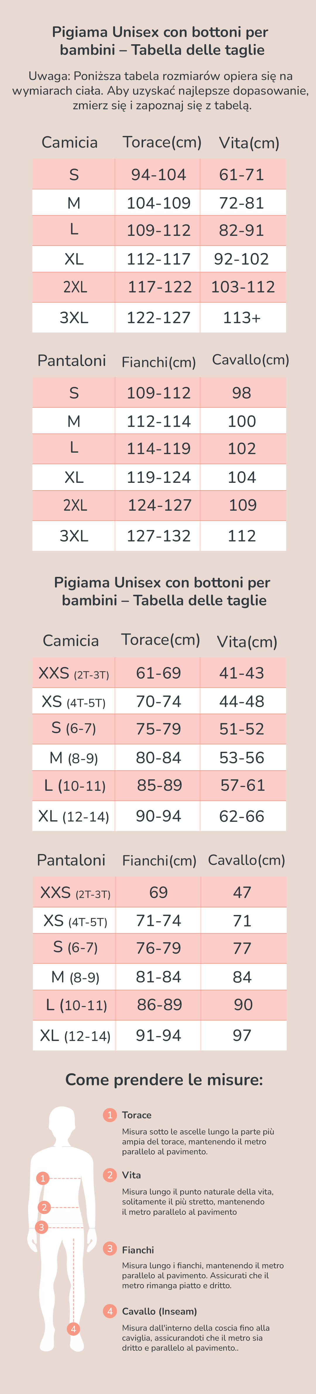 - Bambini: XXS, XS, S, M, L, XL